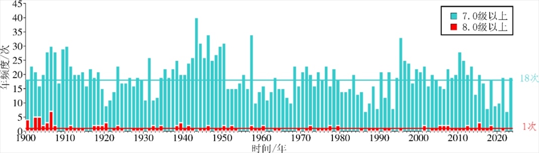 2023年全球未發(fā)生8級(jí)以上地震,最近一次為2021年7月29日美國(guó)阿拉斯加以南海域8.1級(jí)地震。2023年全球發(fā)生7級(jí)以上地震19次,與1900 年以來年均頻次(18 次)基本持平,顯著高于2022年7級(jí)以上地震的活動(dòng)水平(7次)。