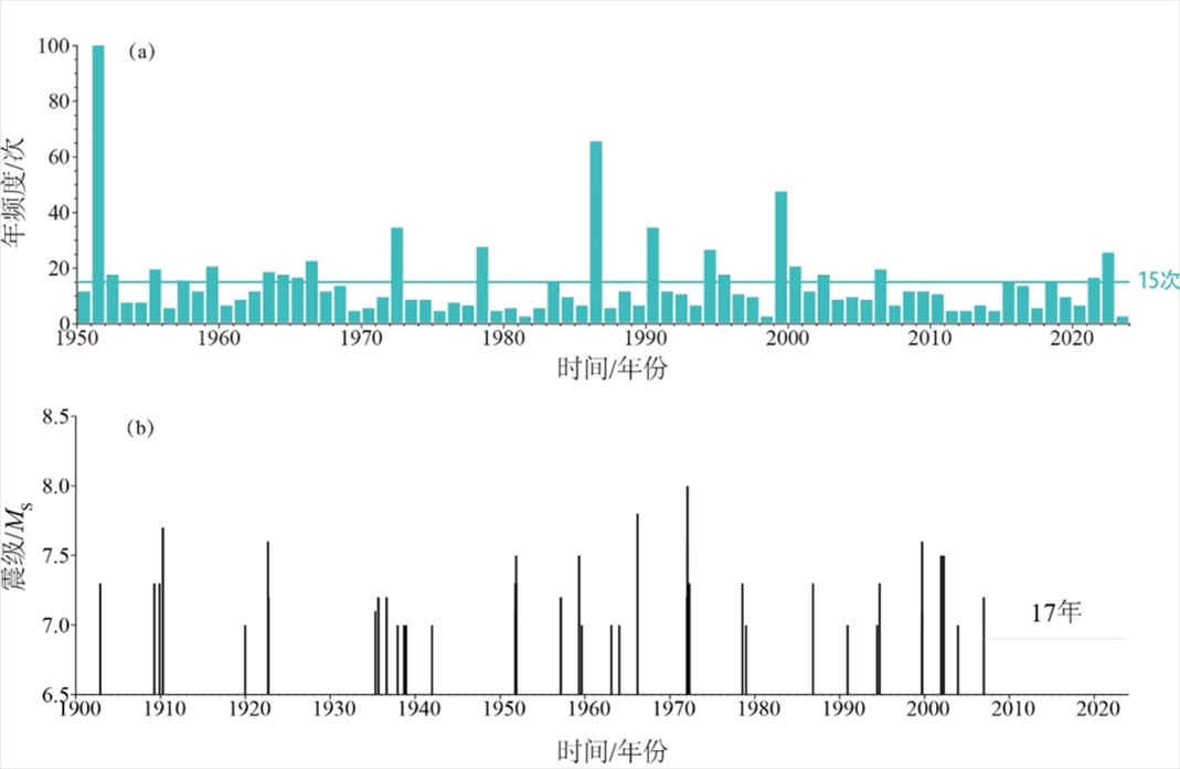 2023年臺(tái)灣及近海發(fā)生5級(jí)以上地震3次,最大為10月24日臺(tái)灣花蓮縣海域5.9級(jí)地震,活動(dòng)水平較2022年(26次)顯著減弱,為2000年以來頻次最低的年份。且自2006年12月26日臺(tái)灣恒春海域7.2級(jí)地震后,臺(tái)灣7級(jí)以上地震已平靜17年,為1900年以來最長(zhǎng)平靜。