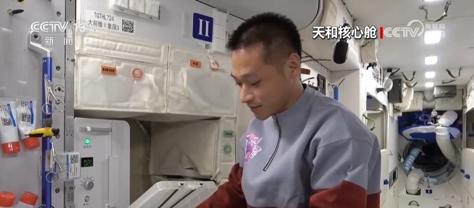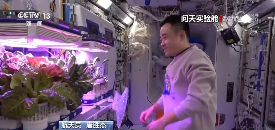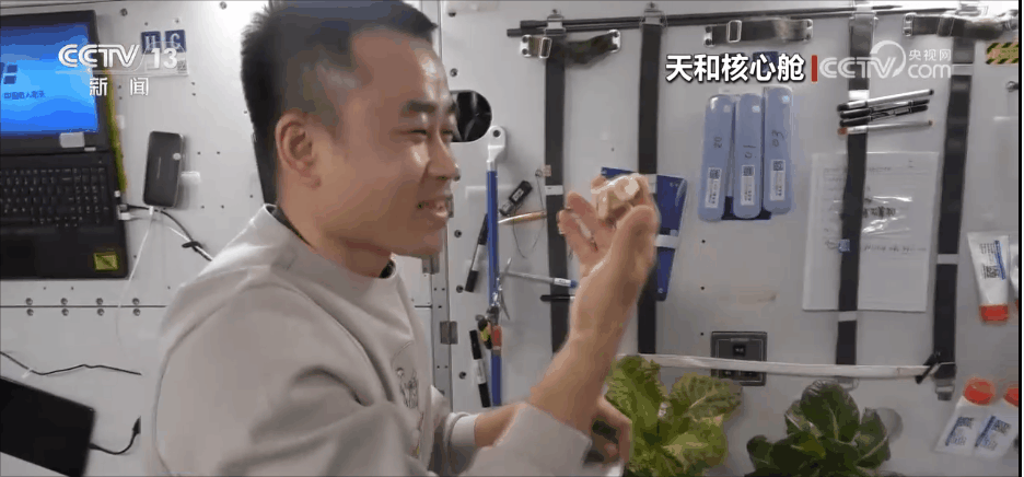 航天員 唐勝杰:你好,我正在對我們的櫻桃番茄進行授粉。因為太空沒有小蜜蜂,我就是那只小蜜蜂。大家看一看,這是我們的太空蔬菜,神十七乘組在“太空出差”期間,我們的太空菜園變得更大了,大家看看我們的蔬菜是不是長勢喜人?今天是新年的第一天,江新林為我們準備了營養(yǎng)豐盛的太空午餐,但是我覺得今天應該再增加一點綠色的、新鮮的蔬菜,午餐就會變得更豐盛了。大家可以看一看,看看我們的櫻桃番茄。誒,拿這兩杯,今天中午我們就吃這兩杯。