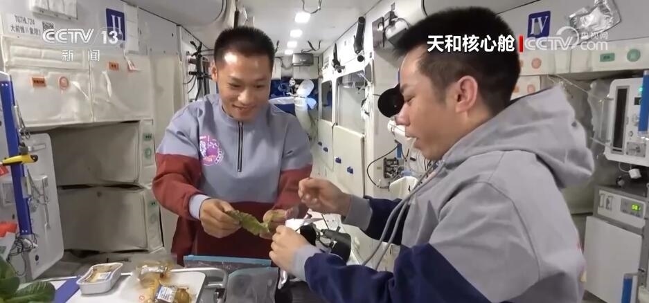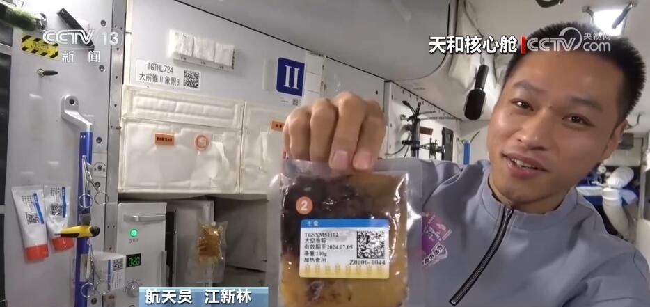 航天員 江新林:我是今天的太空美食家,讓我?guī)ьI(lǐng)大家一起來探索發(fā)現(xiàn)今天的太空美食。我們先看一下主食,熱乎乎的,看看里面都有什么吧,有01最愛吃的白米飯,小心燙哦,02愛吃的面條,我的炒飯。好了,把它粘在餐桌上。然后再讓我們看看我為他們準備的驚喜。看看這是什么?這是我們冬至特意結(jié)余的餃子,還有蔬菜副食。地面上的工作人員考慮得特別周到,按照個人的口味為我們準備了美味的食品,而且將它們塑封包裝,給我們節(jié)余時間的時候又保證它的口味。這是網(wǎng)紅太空香粽,大家印象比較深刻吧,還有這個年糕也是特別好吃、特別美味,還有紅燴豬排,保證有足夠的蛋白質(zhì)攝入量。很豐盛。請看這里,我們特意留了一些新鮮的水果,看看都有什么吧,有美味的蘋果,還有葡萄,大家這個都特別愛吃,我們?nèi)齻€在一起分享一下。