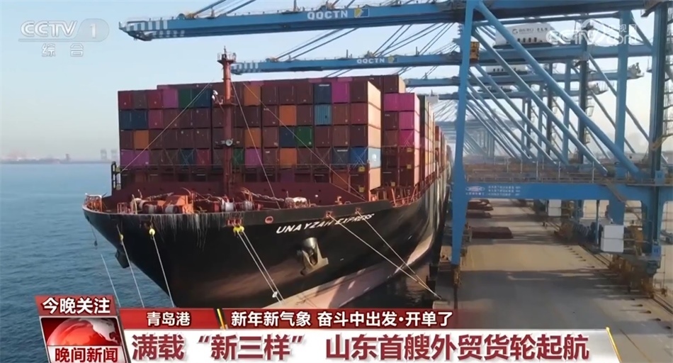 新年伊始,山東首艘外貿(mào)貨輪從青島港起航。3500多個標(biāo)箱里滿載包括電動載人汽車、鋰離子蓄電池、太陽能電池等外貿(mào)“新三樣”,總貨值約2億人民幣。