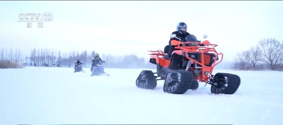在同江市,當?shù)匾惶幯┑啬ν性囻{現(xiàn)場,機車轟鳴,四臺最新研發(fā)的雪地摩托是專門為冬季雪地旅行和娛樂而設計的機動車輛。