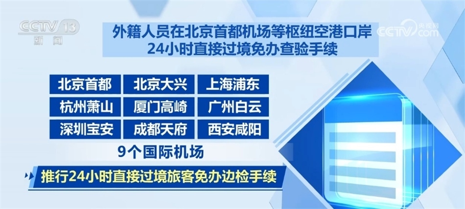 外籍人員在北京首都機(jī)場等樞紐空港口岸24小時(shí)直接過境免辦查驗(yàn)手續(xù)。在北京首都、北京大興、上海浦東、杭州蕭山、廈門高崎、廣州白云、深圳寶安、成都天府、西安咸陽9個國際機(jī)場,推行24小時(shí)直接過境旅客免辦邊檢手續(xù)。對于持24小時(shí)內(nèi)國際聯(lián)程機(jī)票,經(jīng)上述任一機(jī)場過境前往第三國或地區(qū)的出入境旅客,可以免辦邊檢手續(xù),直接免簽過境。