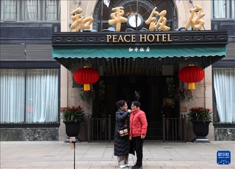 1月9日,市民在南京東路上的和平飯店前整理服裝,準備自拍。新華社記者 劉穎 攝