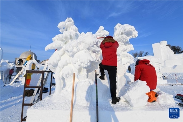 1月8日,選手在太陽島雪博會園區(qū)內(nèi)制作雪雕。新華社記者 王松 攝