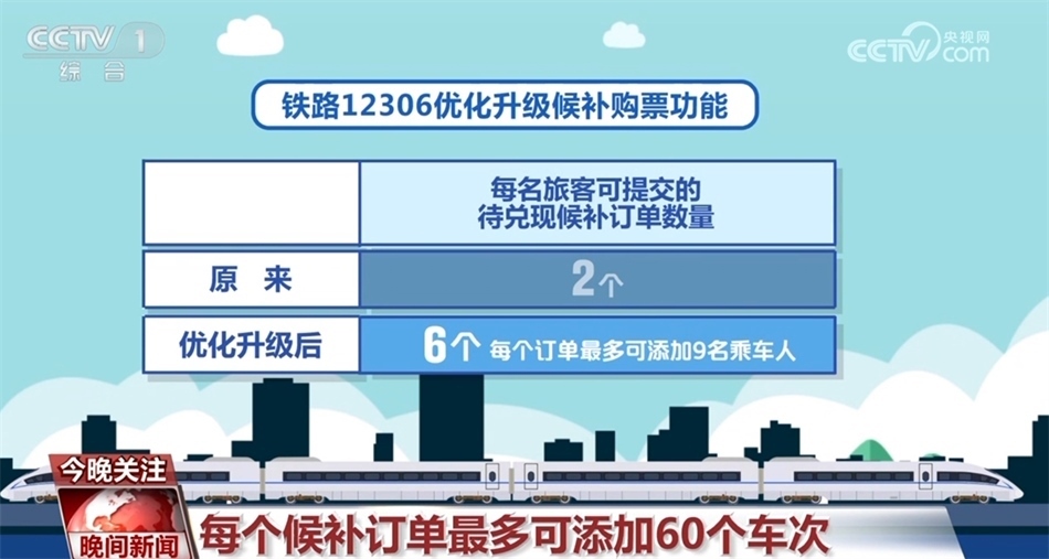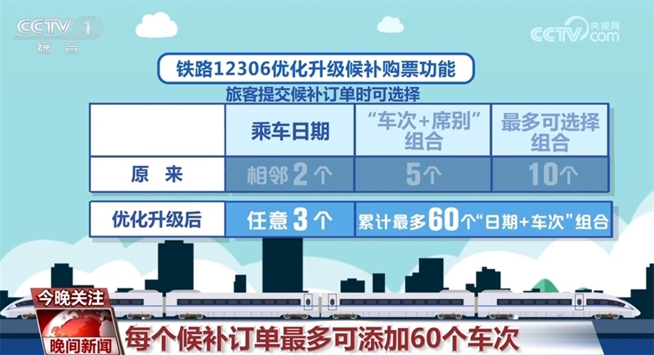 自1月11日零時(shí)起,鐵路12306優(yōu)化升級(jí)候補(bǔ)購(gòu)票功能,來看一下具體變化:優(yōu)化升級(jí)后,每名旅客可提交的待兌現(xiàn)候補(bǔ)訂單數(shù)量由2個(gè)增至6個(gè),每個(gè)訂單最多可添加9名乘車人;原來旅客提交候補(bǔ)訂單時(shí),可選擇相鄰2個(gè)乘車日期、每個(gè)日期可選擇5個(gè)“車次+席別”的組合,最多可選擇10個(gè)組合。優(yōu)化升級(jí)后,旅客可選擇預(yù)售期內(nèi)任意3個(gè)乘車日期,累計(jì)最多可選擇60個(gè)“日期+車次”的組合;原來候補(bǔ)訂單截止兌現(xiàn)時(shí)間最晚為開車前2小時(shí),優(yōu)化升級(jí)后調(diào)整為開車前20分鐘。