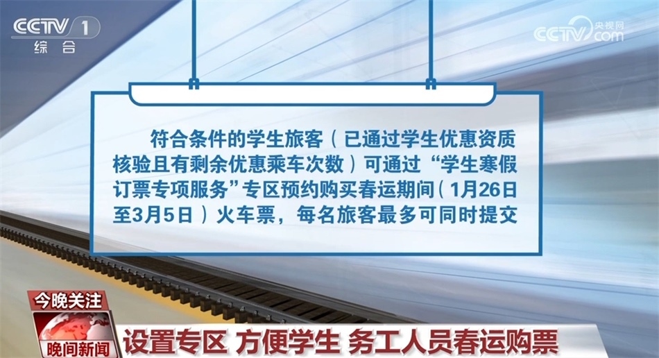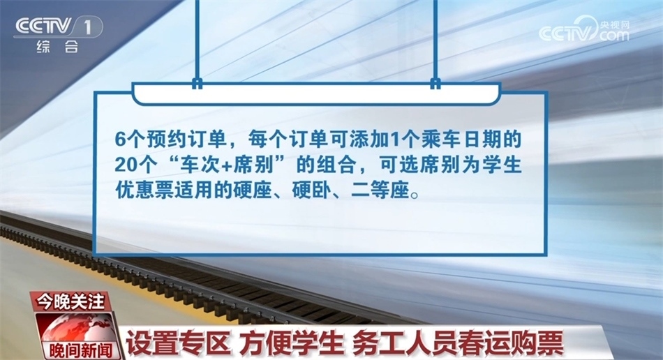 此外,符合條件的學(xué)生旅客(已通過學(xué)生優(yōu)惠資質(zhì)核驗(yàn)且有剩余優(yōu)惠乘車次數(shù))可通過“學(xué)生寒假訂票專項(xiàng)服務(wù)”專區(qū)預(yù)約購(gòu)買春運(yùn)期間(1月26日至3月5日)火車票,每名旅客最多可同時(shí)提交6個(gè)預(yù)約訂單,每個(gè)訂單可添加1個(gè)乘車日期的20個(gè)“車次+席別”的組合,可選席別為學(xué)生優(yōu)惠票適用的硬座、硬臥、二等座。