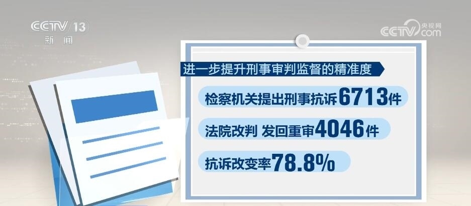 進(jìn)一步提升刑事審判監(jiān)督的精準(zhǔn)度,檢察機(jī)關(guān)提出刑事抗訴6713件,法院改判、發(fā)回重審4046件,抗訴改變率78.8%。同時(shí),檢察機(jī)關(guān)深化“派駐+巡回”檢察工作,對不當(dāng)減刑、假釋、暫予監(jiān)外執(zhí)行共提出糾正意見1.8萬人。
