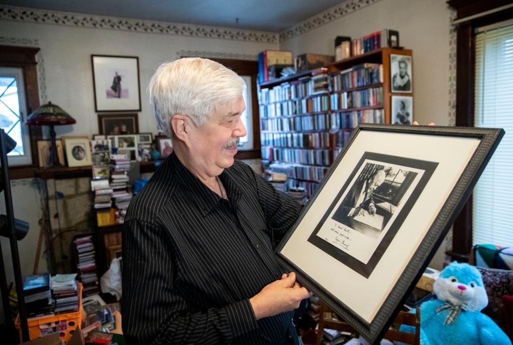 2019年1月29日,達維德·布思在位于美國新澤西的家中展示曾率費城交響樂團到中國首演的指揮尤金·奧曼迪的照片。