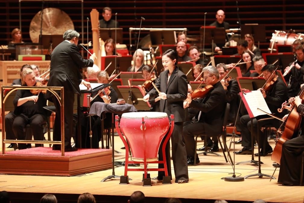 1月12日,在美國費城,上海交響樂團打擊樂演奏家付藝霏(中)在2024年費城交響樂團新春音樂會上演出。
