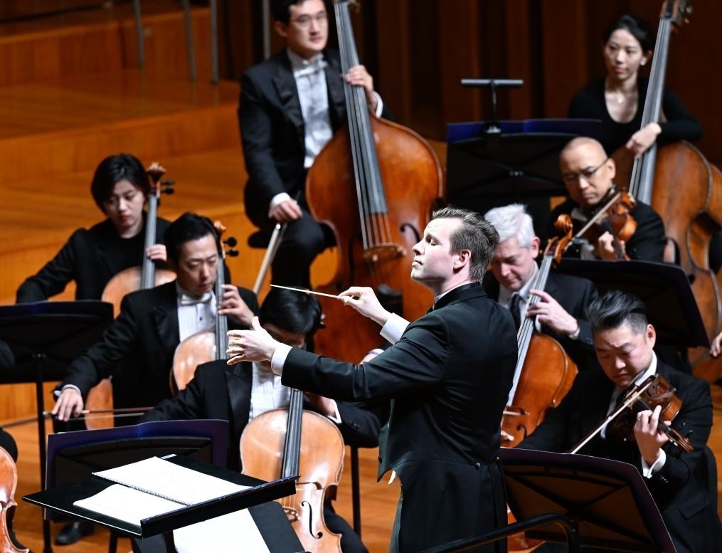 1月12日,在美國費城,中國指揮家余?。ㄖ校┰?024年費城交響樂團新春音樂會上指揮。