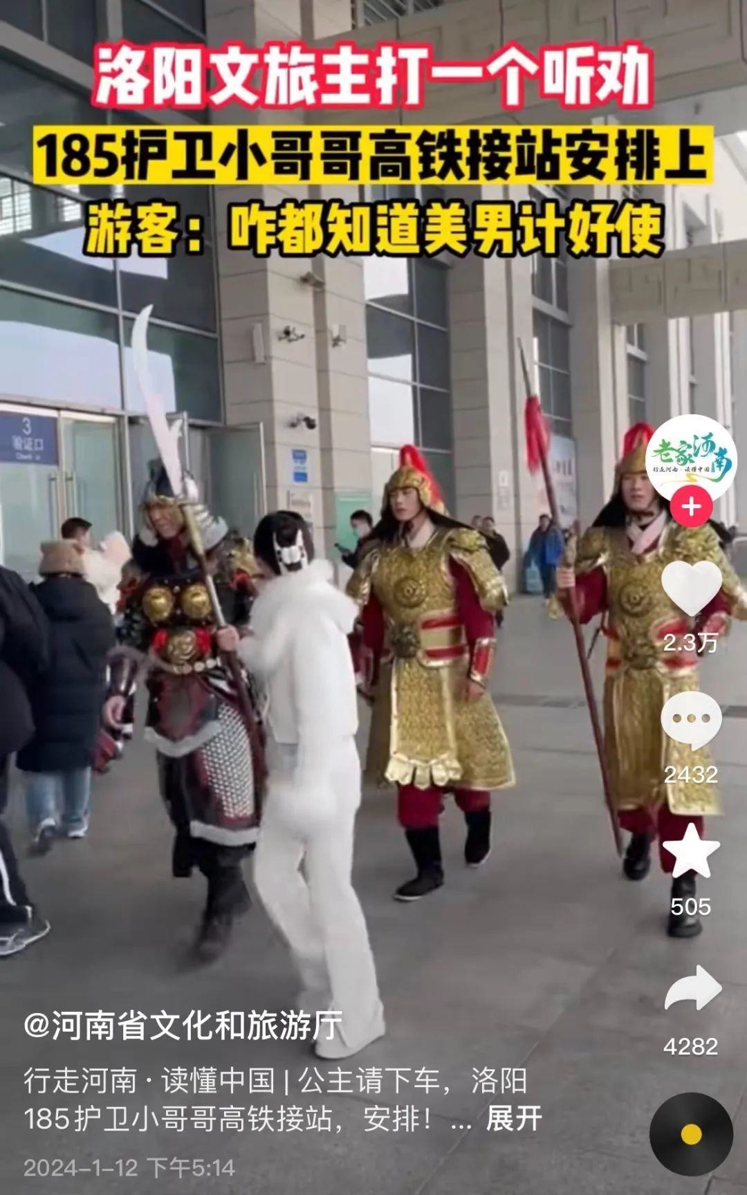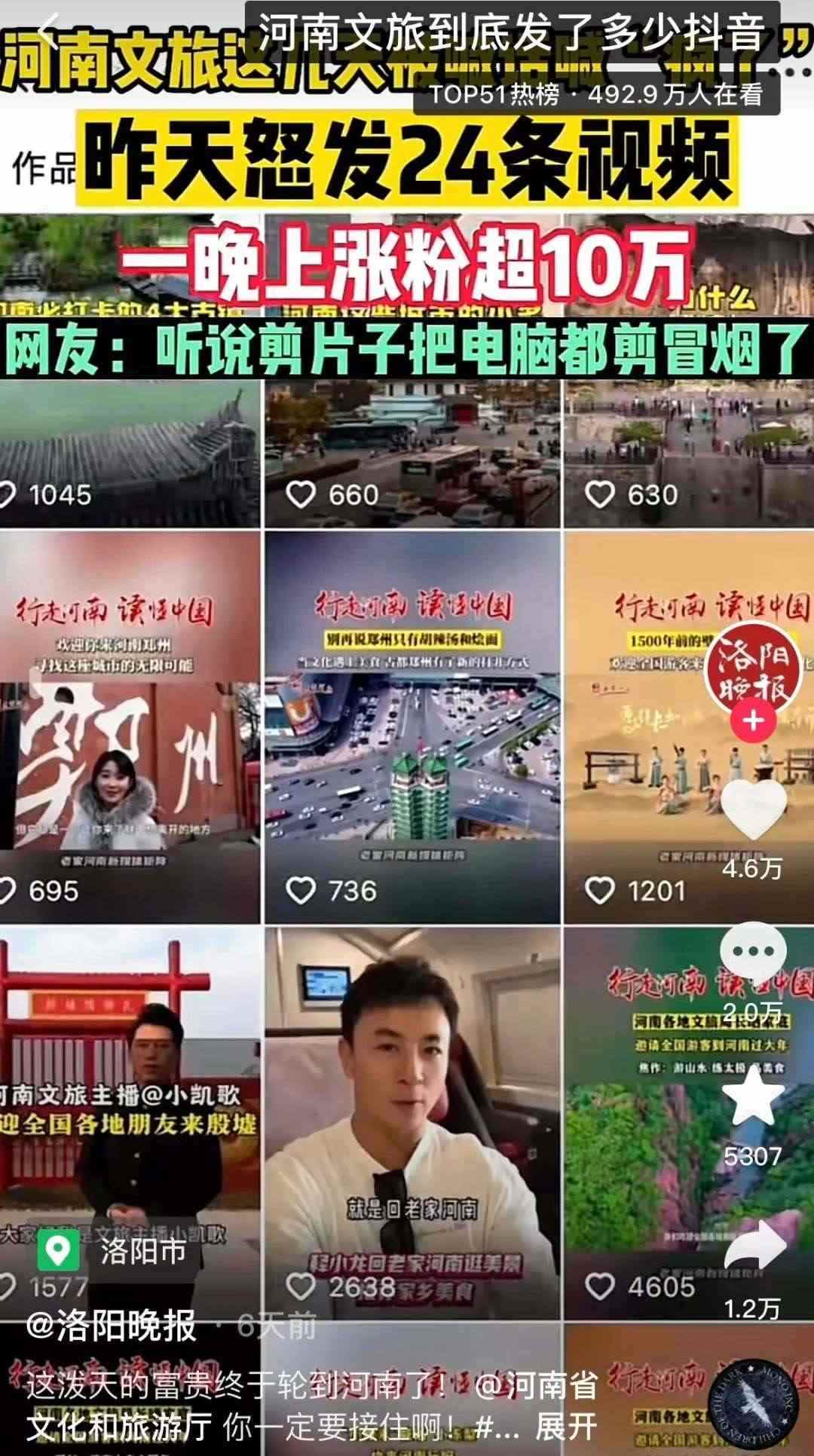有人統(tǒng)計(jì),自1月9日起,河南文旅官方賬號“河南省文化和旅游廳”每天發(fā)布二三十條視頻,連續(xù)四天發(fā)布了112條視頻,持續(xù)展示本地文旅資源,吸引了近百萬新粉絲,主打一個“量變總會引起質(zhì)變”,以至于“河南文旅到底發(fā)了多少抖音”相關(guān)話題成為熱門搜索。