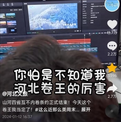 有網(wǎng)友建議賬號改名為“河北文旅”,“不然都搜不到”,“聽勸”的官方賬號火速改名,并發(fā)布視頻“宣戰(zhàn)”,“山河四省互不內(nèi)卷?xiàng)l約正式結(jié)束,今天這個卷王我當(dāng)定了”,于是開始“瘋狂輸出”,日更75條,可還了得?