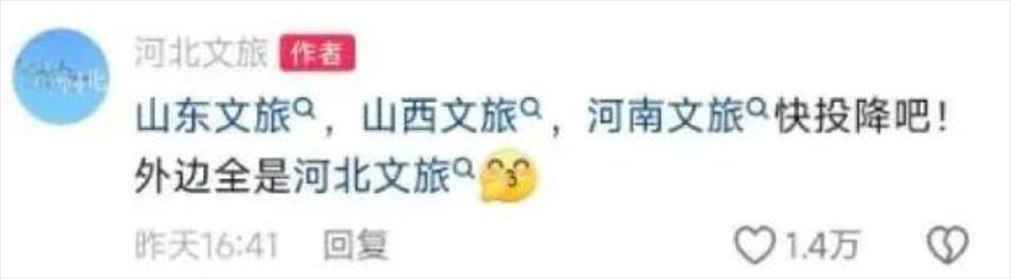 此前,山西、河南宣布結(jié)成“旅游搭子”,豫晉六城114家A級景區(qū)門票互免,見河南文旅“悄悄努力驚艷所有人”,山西文旅“醋壇子立馬打翻了”,直接喊麥……