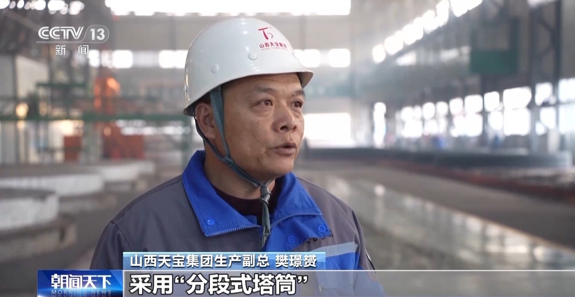 山西天寶集團生產(chǎn)副總 樊璟赟:解決運輸難的問題,采用“分段式塔筒”。我們和鏈主通過多次試驗,目前我們能達到分開以后它的變形量在1毫米之內(nèi)。