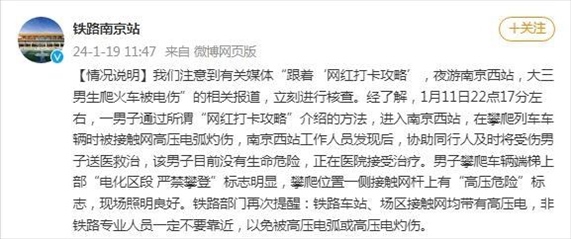 ·南京站回應“大學生爬火車打卡被燒傷進ICU”:男子無生命危險,接觸網(wǎng)均有高壓電非專業(yè)人員不要靠近。