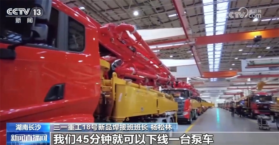 三一重工18號(hào)新品焊接班班長 楊松林:大家好,我是新品焊接班班長楊松林。我們工廠主要是生產(chǎn)泵車,看,就是我身后的這個(gè)大家伙。我們45分鐘就可以下線一臺(tái)泵車。