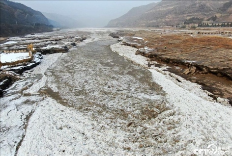 山西臨汾:黃河壺口瀑布現(xiàn)“冰岸齊平”景觀。