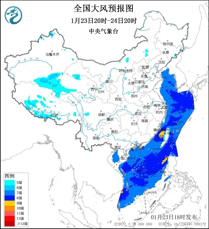 中央氣象臺(tái)1月23日18時(shí)繼續(xù)發(fā)布大風(fēng)藍(lán)色預(yù)警:預(yù)計(jì),1月23日20時(shí)至24日20時(shí),西藏南部、青海西部、福建沿海、廣東沿海等地的部分地區(qū)有5~6級(jí)、陣風(fēng)7~8級(jí)的大風(fēng);黃海大部海域、東海大部海域、臺(tái)灣海峽、臺(tái)灣以東洋面、巴士海峽、北部灣、南海大部海域?qū)⒂?~8級(jí)、陣風(fēng)9~10級(jí)的大風(fēng),其中臺(tái)灣海峽、巴士海峽、南海中東和西南部的部分海域風(fēng)力可達(dá)9級(jí)、陣風(fēng)10~11級(jí)。