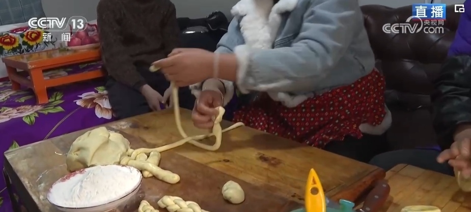 炸年饃是當(dāng)?shù)赝磷迦罕娪哟汗?jié)的傳統(tǒng)習(xí)俗。一家人齊上陣,這邊兩位大姐正在將發(fā)好的面揉好、揪出面劑子、搟成圓形、表面抹上清油,放進(jìn)油鍋里炸熟。對于土族群眾來說,進(jìn)入臘月之后就開始做年饃、宰年豬、置辦年貨,年味兒就濃了。炸年饃是當(dāng)?shù)厝罕娖碓感碌囊荒觑L(fēng)調(diào)雨順、五谷豐登、平安順?biāo)斓拿篮迷⒁狻V谱髂牮x的面粉、菜籽油等材料都是政府給受災(zāi)群眾提供的物資。
