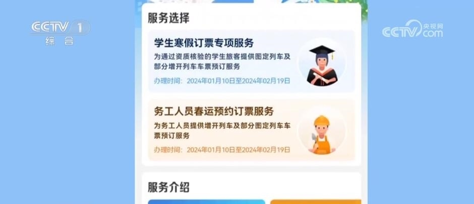 今年春運(yùn),鐵路部門推出預(yù)約購票和預(yù)填購票兩項(xiàng)購票新方式,預(yù)約購票功能專門針對(duì)學(xué)生和務(wù)工人員。符合條件的學(xué)生旅客(已通過學(xué)生優(yōu)惠資質(zhì)核驗(yàn)且有剩余優(yōu)惠乘車次數(shù))可通過“學(xué)生寒假訂票專項(xiàng)服務(wù)”專區(qū)預(yù)約購買春運(yùn)期間的火車票。已通過實(shí)名制核驗(yàn)的務(wù)工人員可通過“務(wù)工人員春運(yùn)預(yù)約訂票服務(wù)”專區(qū)預(yù)約購買春運(yùn)期間火車票。