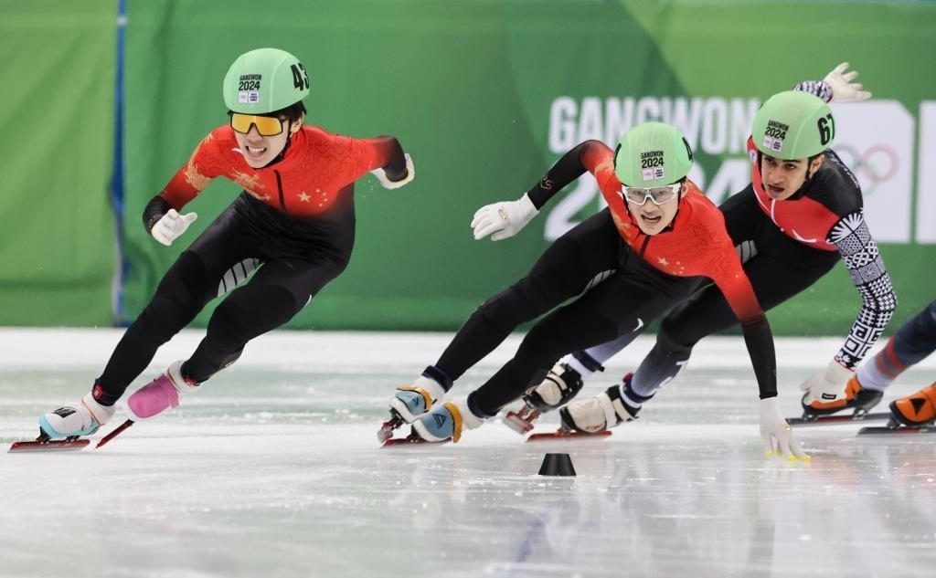 1月21日,張心喆(中)和隊(duì)友張柏浩(左)在男子1000米決賽中。新華社記者 姚琪琳 攝