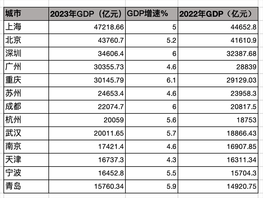萬(wàn)億城市的另一個(gè)看點(diǎn)還在于是“十強(qiáng)城市卡位戰(zhàn)”。2023年GDP第十城是南京,近1.75萬(wàn)億。身后是天津、寧波和青島,3個(gè)城市在2023年GDP分別是1.67、1.64、1.57億元。