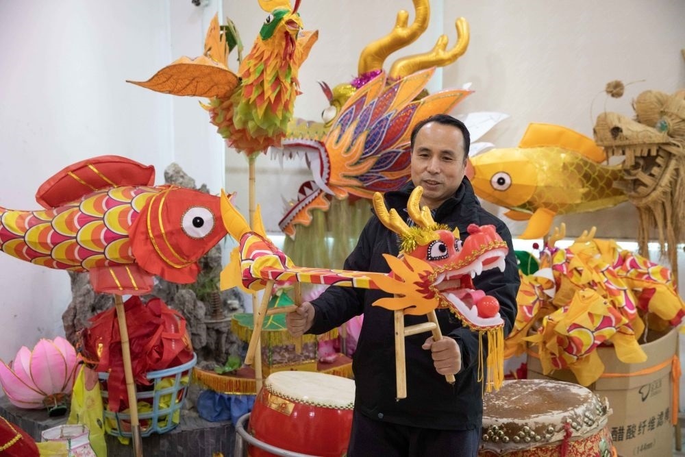 1月30日,南昌市青云譜區(qū)城南龍燈工廠,城南龍燈傳承人史克濱展示為兒童設計生產的小板凳龍。新華社發(fā)(孫睿澤 攝)