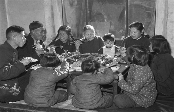 1953年,天津市民王德鑄(左一)一家人吃團圓飯。