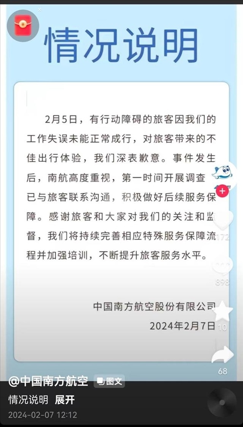 ·網(wǎng)友稱(chēng)成功申請(qǐng)坐輪椅獨(dú)飛后遭拒載,南航道歉:工作失誤致旅客未能正常成行。