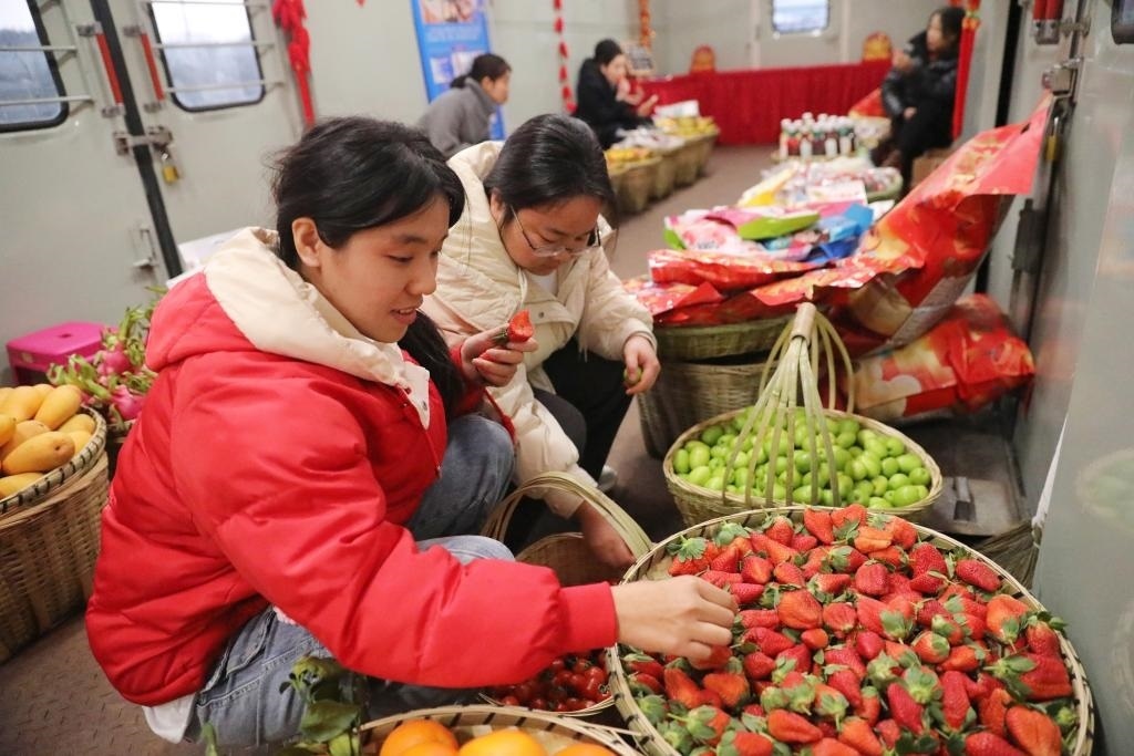 乘坐7466次列車的旅客在“慢火車”上的年貨街挑選草莓。(中國(guó)鐵路昆明局集團(tuán)有限公司供圖)