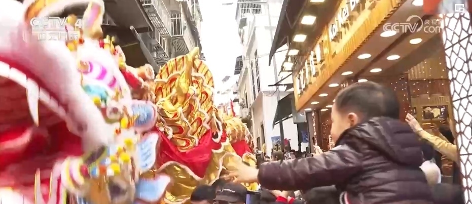 農(nóng)歷春節(jié)大年初一,澳門特區(qū)政府旅游局舉辦“歡樂春節(jié)——2024年龍騰舞躍賀新春”社區(qū)巡演活動(dòng)。238米長(zhǎng)的大金龍和18頭醒獅,穿越澳門大街小巷和主要景區(qū),市民和游客紛紛伸手觸摸金龍和醒獅,迎春納福。