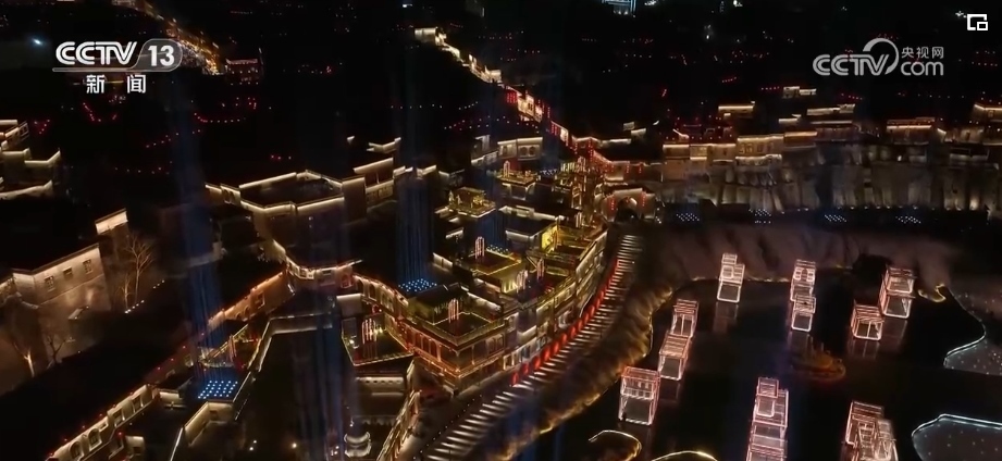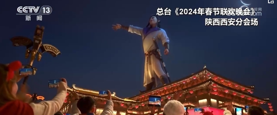 除夕當(dāng)晚9時(shí),西安分會(huì)場(chǎng)《山河詩長(zhǎng)安》篇章的“打開方式”讓人眼前一亮。在科技助力下,“詩仙”李白跨越歲月長(zhǎng)河“穿越”而來,在煙火璀璨中,隨著熙熙攘攘的人群一起走進(jìn)西安城墻永寧門,走入千年后的耀眼長(zhǎng)安。