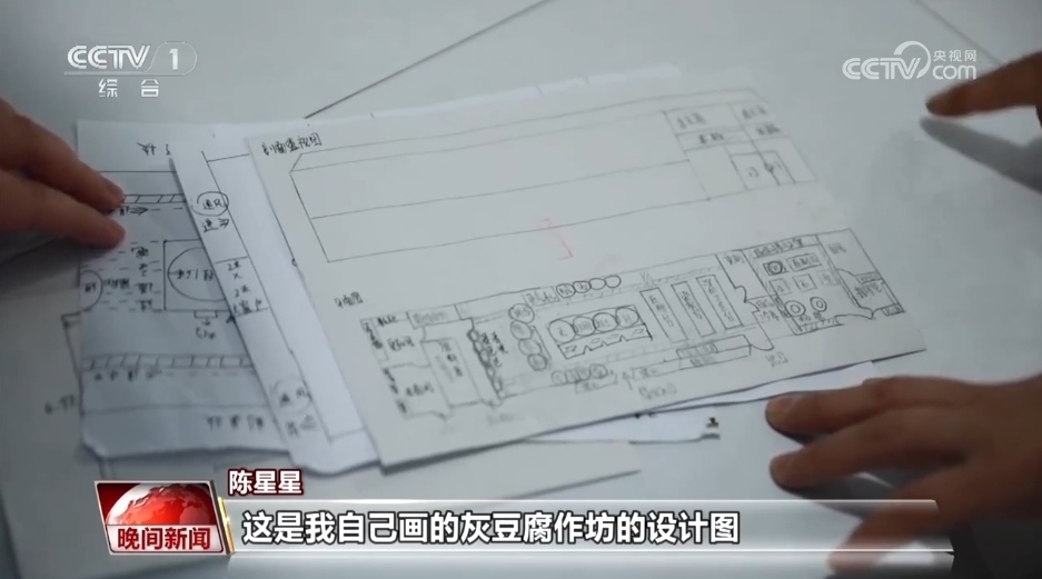 陳星星:這是我自己畫的灰豆腐作坊的設計圖。我們之前用傳統(tǒng)的在家里做的這種方式做出來的豆腐的話,一天最多可能就是一兩百斤的樣子,那么經過我們這樣的一個改進的話,一天可能能達到一兩千斤的產量。