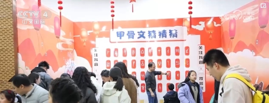 博物館內(nèi)的漢字展、漢服秀、甲骨文韻律操、文創(chuàng)集市等豐富多彩的節(jié)目,也給游客帶來了不一樣的新春體驗(yàn)和感受。識(shí)讀甲骨文,能讓大家對(duì)漢字演變過程有更加直觀的認(rèn)識(shí)和了解,在“甲骨文猜猜猜”游戲中,游客們認(rèn)真觀察、思考展板上一個(gè)個(gè)甲骨文所對(duì)應(yīng)的漢字,感受著古人的智慧和漢字的靈性與博大。