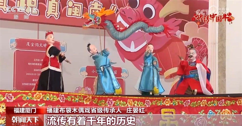同樣在春節(jié)期間受到游客喜愛的還有廈門的非遺項目布袋木偶。莊晏紅是布袋木偶戲演出團(tuán)隊的一員,她告訴我們,春節(jié)期間,團(tuán)隊會有20多場的演出,忙得熱火朝天,在景區(qū)、酒店、藝術(shù)館為游客展示非遺魅力。