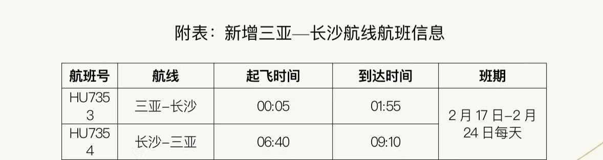 據(jù)悉,在民航局、海南省交通廳的支持下,海南航空積極協(xié)調(diào)申請加班計劃。2月17日至24日期間,海南航空每日新增三亞—長沙往返航班。去程航班HU7353,從三亞起飛時間為凌晨 00:05,到達長沙黃花國際機場時間為01:55;返程航班HU7354,從長沙起飛時間為06:40,到達三亞鳳凰國際機場時間為09:10,以上航班信息以實際查詢?yōu)闇?。旅客可通過海南航空官網(wǎng)及APP、微信公眾號及小程序、服務熱線95339、各直屬售票處及授權代理購買機票。