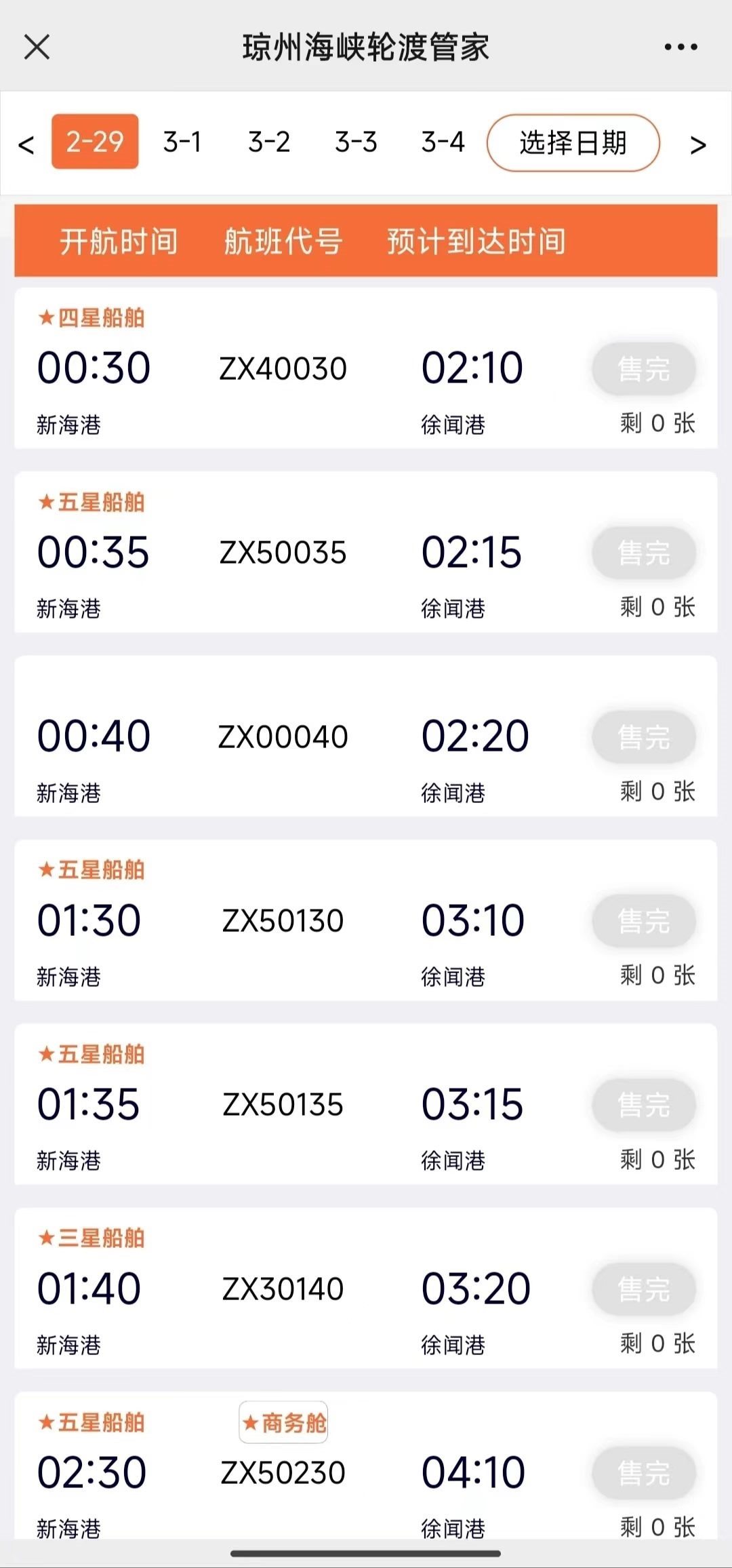 澎湃新聞記者17日上午查詢官方購票平臺“瓊州海峽輪渡管家”發(fā)現(xiàn),實(shí)時數(shù)據(jù)顯示,??谛潞8壑列炻劯鄣男履茉窜囕喍善?,2月17日至2月29日均已售罄。
