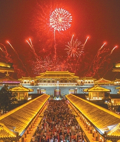 游客們在湖北省襄陽市唐城景區(qū)看煙花秀。當(dāng)?shù)嘏e辦的戲曲文化藝術(shù)節(jié)吸引了眾多省內(nèi)外游客前來,拉動當(dāng)?shù)芈糜谓?jīng)濟。據(jù)統(tǒng)計,2023年國內(nèi)出游人次達(dá)48.91億,國內(nèi)游客出游總花費4.91萬億元。楊 東攝(影像中國)
