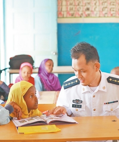 中國人民解放軍駐吉布提保障基地官兵與吉小學(xué)生交流。中國軍隊在吉布提建設(shè)保障基地,是中吉兩國政府經(jīng)過友好協(xié)商作出的決定,為中國軍隊執(zhí)行護(hù)航、維和任務(wù)等提供有力保障。30多年來,我國已派出維和人員5萬余人次,赴20多個國家和地區(qū)參加聯(lián)合國維和行動。王宗洋攝(影像中國)