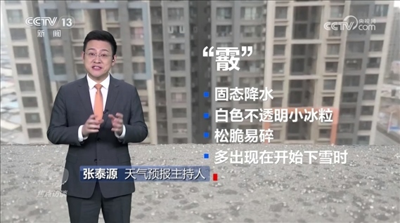 天氣預(yù)報(bào)主持人張?zhí)┰矗骸啊薄且环N固態(tài)降水,由白色不透明的小冰粒組成,近似球形,有時(shí)呈圓錐形,有雪狀結(jié)構(gòu),通常在地面氣溫不太冷時(shí)降落,在剛開(kāi)始下雪的時(shí)候出現(xiàn)?!?/p>