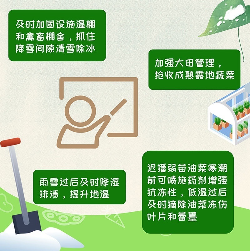 國(guó)家氣象中心生態(tài)和農(nóng)業(yè)氣象室首席宋迎波建議,及時(shí)加固設(shè)施溫棚和禽畜棚舍,抓住降雪間隙清雪除冰,防止大風(fēng)、雪壓等導(dǎo)致棚體垮塌,造成蔬果、畜禽等受凍受損;加強(qiáng)大田管理,搶收成熟露地蔬菜,減輕凍害損失,遲播弱苗油菜寒潮前可噴施藥劑增強(qiáng)抗凍性,低溫過(guò)后及時(shí)摘除油菜凍傷葉片和蕾薹,促進(jìn)恢復(fù)生長(zhǎng);雨雪過(guò)后及時(shí)降濕排漬,提升地溫,尤其是低洼田塊,確保排水暢通,防范積水結(jié)冰凍傷作物根部。