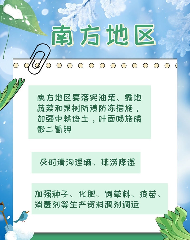 南方地區(qū)要落實(shí)油菜、露地蔬菜和果樹(shù)防漬防凍措施,加強(qiáng)中耕培土,葉面噴施磷酸二氫鉀;及時(shí)清溝理墑、排澇降濕。加強(qiáng)種子、化肥、飼草料、疫苗、消毒劑等生產(chǎn)資料調(diào)劑調(diào)運(yùn)。