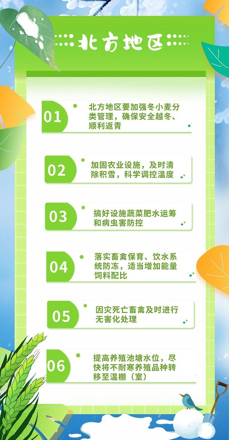 北方地區(qū)要加強(qiáng)冬小麥分類管理,確保安全越冬、順利返青;加固農(nóng)業(yè)設(shè)施,及時(shí)清除積雪,科學(xué)調(diào)控溫度;搞好設(shè)施蔬菜肥水運(yùn)籌和病蟲(chóng)害防控;落實(shí)畜禽保育、飲水系統(tǒng)防凍,適當(dāng)增加能量飼料配比;因?yàn)?zāi)死亡畜禽及時(shí)進(jìn)行無(wú)害化處理;提高養(yǎng)殖池塘水位,盡快將不耐寒養(yǎng)殖品種轉(zhuǎn)移至溫棚(室)。