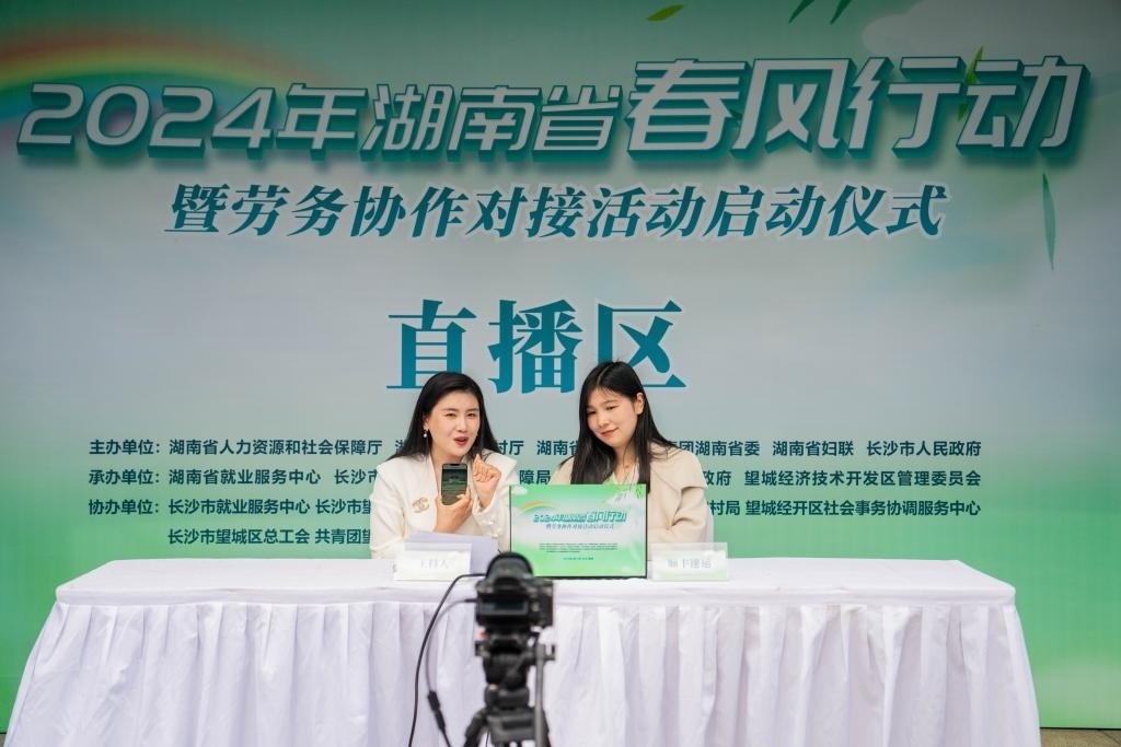 2月19日,在湖南省長沙市望城區(qū)市民廣場,工作人員在“春風行動”招聘活動上通過網絡直播推薦工作崗位。新華社記者 陳思汗 攝