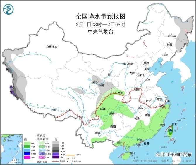 央視網(wǎng)消息:中央氣象臺(tái)網(wǎng)站2月29日消息,過去一天,全國(guó)雨雪逐漸發(fā)展增強(qiáng),北方大部以降雪為主,集中在西北地區(qū)東部、內(nèi)蒙古、山西、山東和東北三省等地;南方地區(qū)雨水范圍明顯擴(kuò)大,江蘇、上海、浙江、安徽南部、江西中北部、湖南中南部、廣西北部等地部分地區(qū)出現(xiàn)中到大雨,今天凌晨起,蘇皖北部出現(xiàn)雨轉(zhuǎn)雪,江蘇連云港、宿遷、徐州等地雪花紛飛,并伴隨低溫和大風(fēng)天氣,體感十分寒冷。