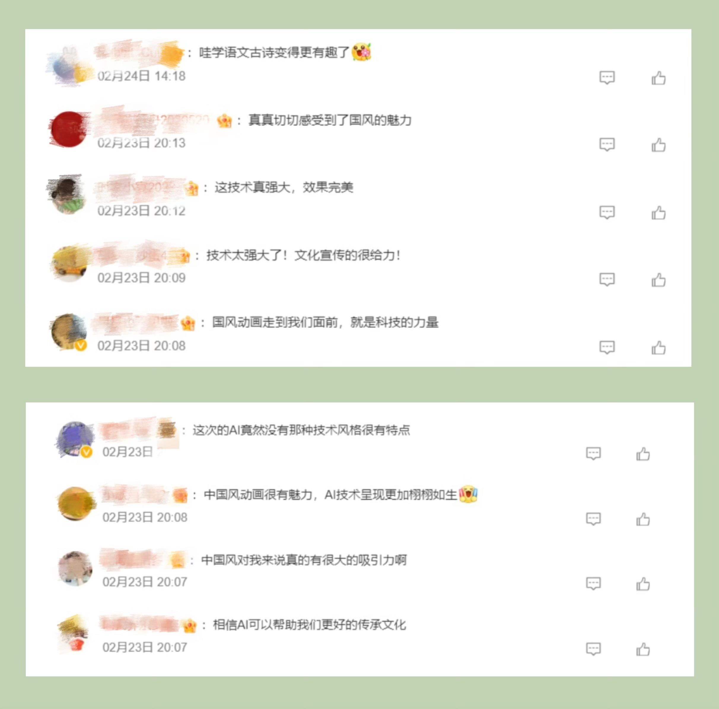 節(jié)目探索詩(shī)畫(huà)融通的國(guó)風(fēng)動(dòng)畫(huà)片新呈現(xiàn),讓廣大青少年進(jìn)一步加深了對(duì)中國(guó)經(jīng)典詩(shī)詞的理解和喜愛(ài)?!癆I”“總臺(tái)”“千秋詩(shī)頌”等成為網(wǎng)友熱議高頻詞。截至2月27日20:00,話題#千秋詩(shī)頌#閱讀量超791萬(wàn)次。網(wǎng)友紛紛留言:“看到這個(gè)系列片,我真的深深感受到了中國(guó)傳統(tǒng)文化的深厚底蘊(yùn)。這些古詩(shī)詞深入骨髓,流淌在我們的血液中,是我們國(guó)家的文化符號(hào)”“以AI為媒,央視制作的這部國(guó)風(fēng)動(dòng)畫(huà)片傳承了經(jīng)典,喚醒了古韻的新生命”“唯美的畫(huà)面讓人動(dòng)容,用視覺(jué)的形式了解《別董大》這一首古老的詩(shī)歌更別有一番韻味”“這種科技與動(dòng)畫(huà)片的結(jié)合,恰好是現(xiàn)在小朋友們和大朋友們所需要的”。
