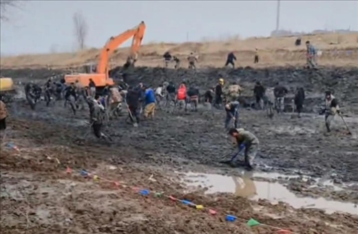 ·天津一河道清淤挖出金子銅錢?當(dāng)?shù)乇僦{:假的,已經(jīng)立牌禁止市民私挖。
