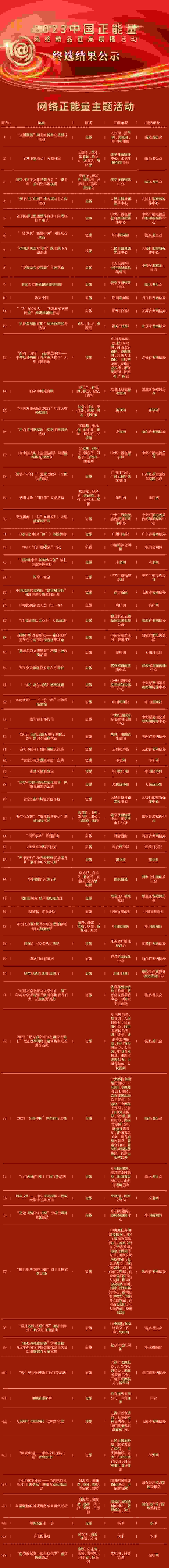 根據(jù)《2023中國正能量網(wǎng)絡(luò)精品征集展播活動(dòng)規(guī)則》,現(xiàn)對(duì)擬入選作品進(jìn)行公示,公示時(shí)間為3月11日至3月15日,公示期間歡迎社會(huì)各界監(jiān)督評(píng)議,有關(guān)意見可發(fā)送至郵箱zgznl100@cac.gov.cn,公示期滿后將適時(shí)對(duì)外發(fā)布最終結(jié)果,并在線上進(jìn)行集中展播。