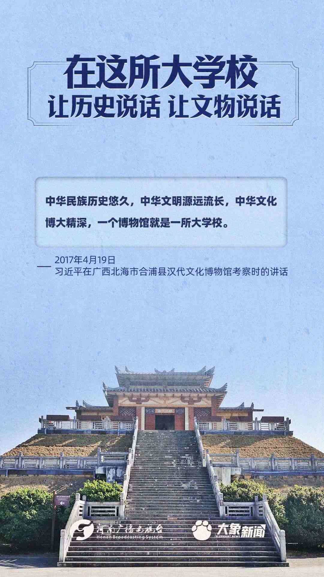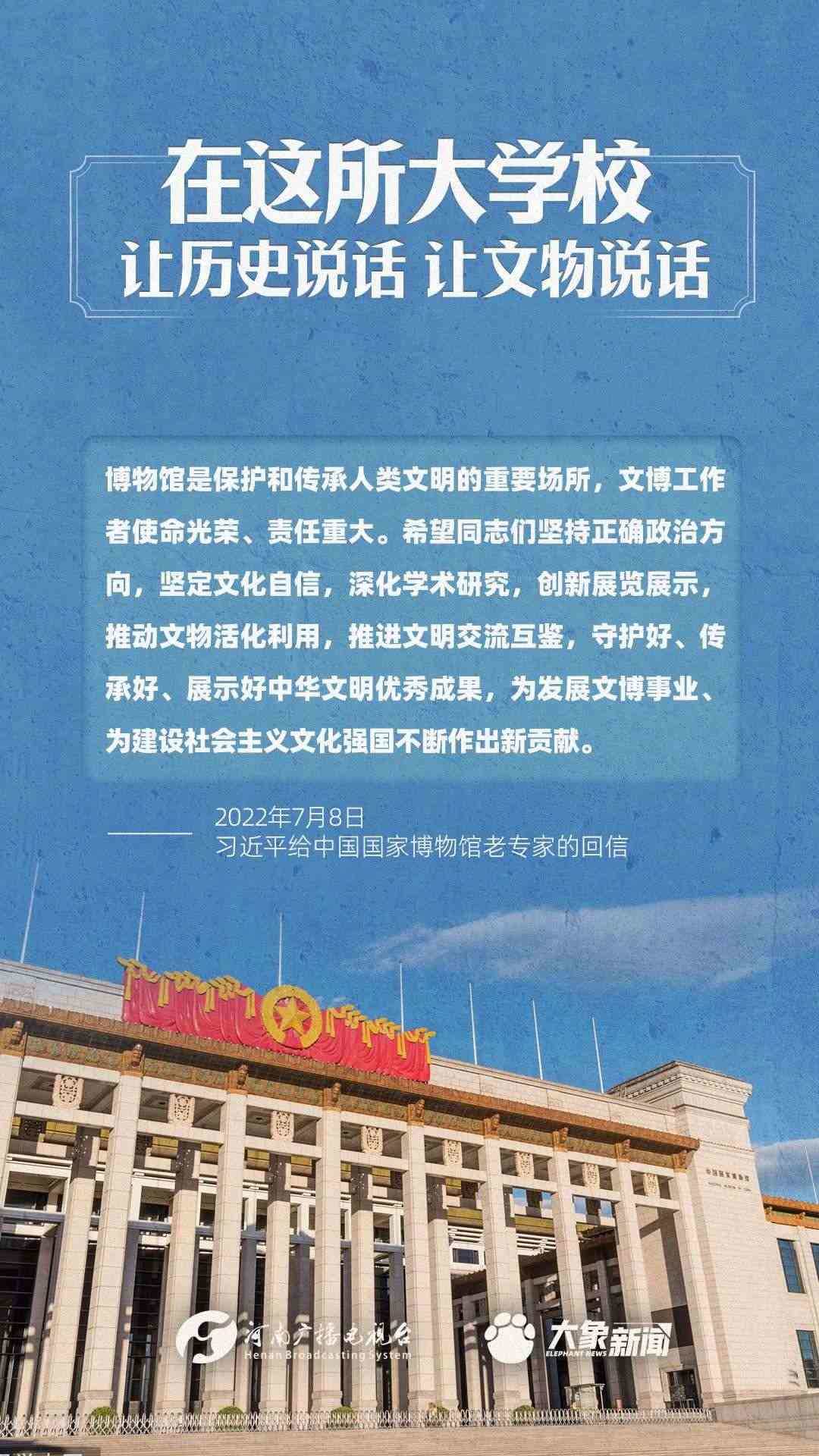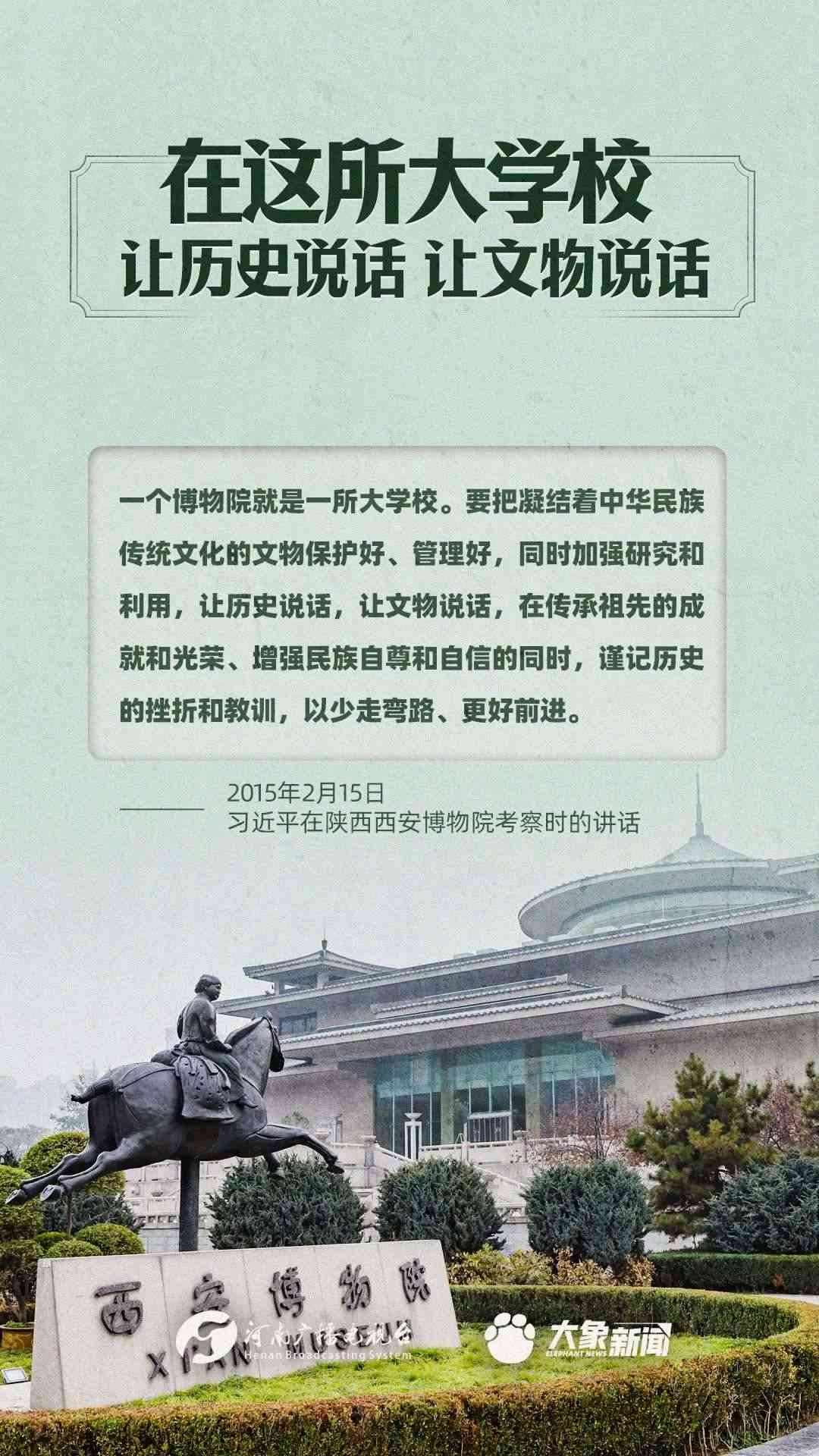 習近平總書記一直高度重視博物館工作,多次作出重要講話,強調“一個博物院就是一所大學?!?,指出“讓歷史說話,讓文物說話”,要求“守護好、傳承好、展示好中華文明優(yōu)秀成果”等等,金句連連。大象新聞進行了認真梳理,邀您一起學習。
